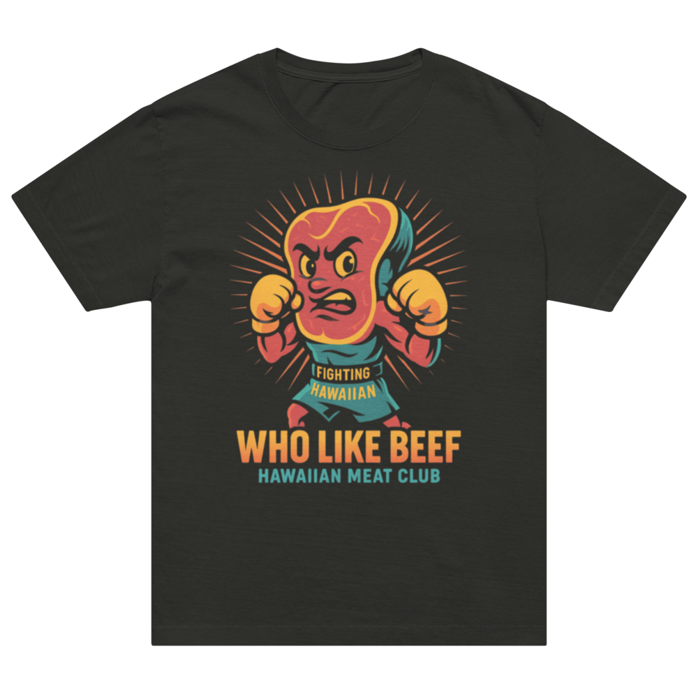 Turn heads and spark laughs with the Who Like Beef tee — a bold tribute to island toughness and local humor. Featuring a cartoon steak ready to throw hands, this design reppin’ “Da Fighting Hawaiian” is for those who don’t back down from a little heat.